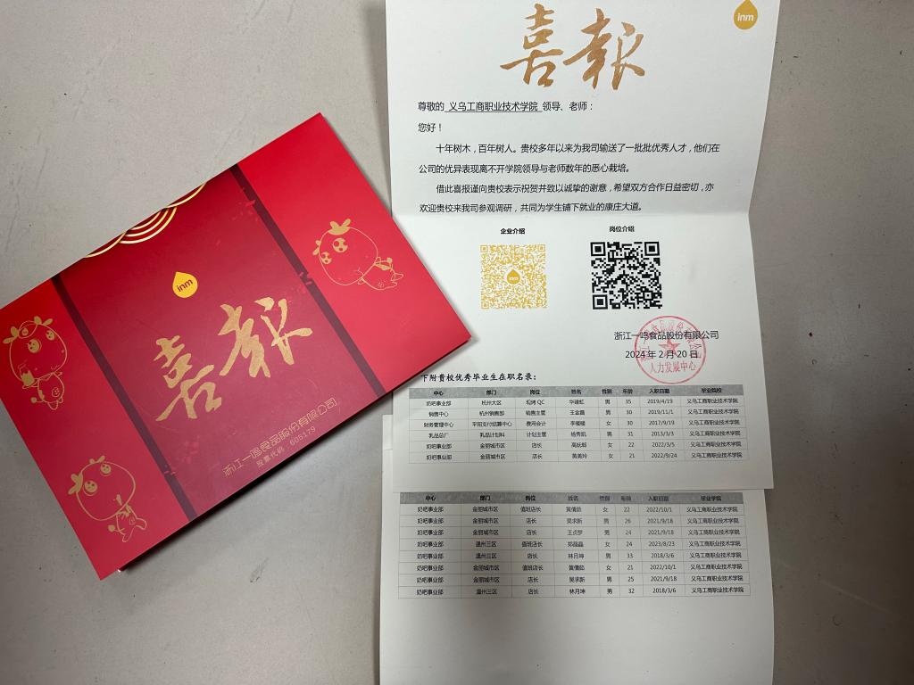 近日,经济管理学院收到一封来自浙江一鸣食品股份有限公司的喜报。信中高度认可吴求新等13位毕业生在岗的优异表现,并向学校为公司发展输送一批批优秀人才致以诚挚的谢意,期待未来能与学校更加紧密合作。