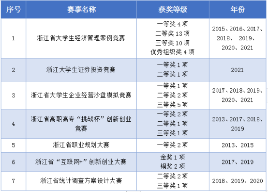 工商企业管理专业学生在校期间可参加各类竞赛,不仅能促进理论知识的学习和掌握,而且更加强化了理论与实际结合的实践能力,提高自身的创新和创意能力、整合知识的学习能力、指导实践的应用能力、复杂问题的解决能力等。专业学生获得省级大赛奖项如下表所示: