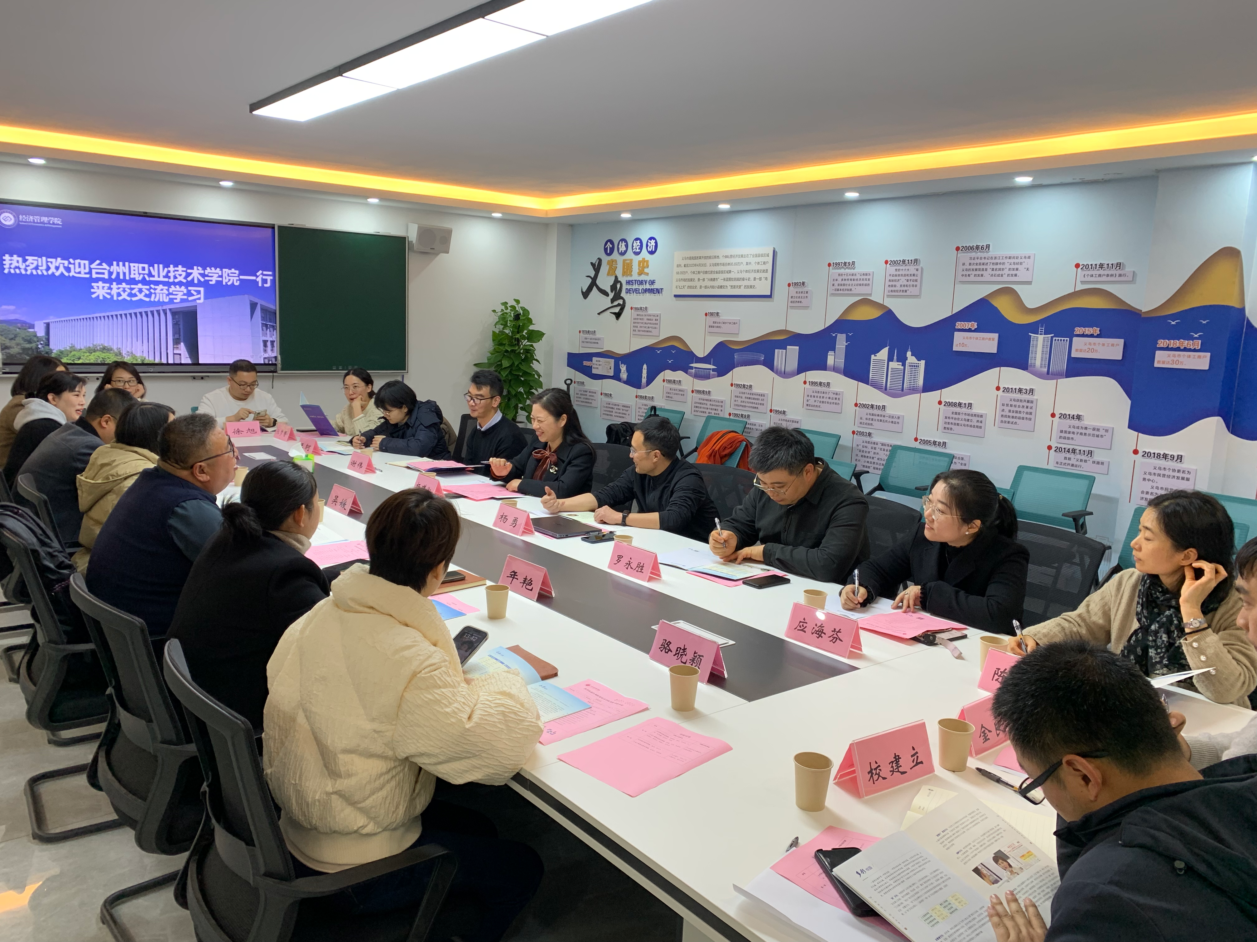 座谈会上,经济管理学院负责人代表学院对台州职业技术学院的到来表示热烈欢迎,并详细介绍了学院在办学特色、教学科研、人才培养、专业建设等方面的做法和成效。双方就相关专业人才培养、学生技能竞赛组织培训、实验室规划与建设等方面的具体做法和经验展开了深入交流和探讨。
