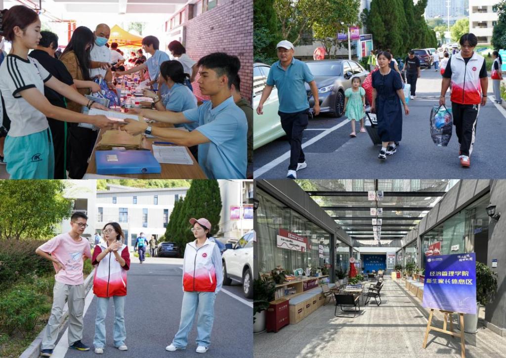 学院报到处秩序井然,经济管理学院为新生准备了丰富的“信”义礼包,内含学院定制手提袋、新学期校历、大学初企划卡等。在学院门前,学院学生工作负责人与新生代表共同鸣锣,表明大学之旅正式启航。在信义客厅、校园e金融银行,络绎不绝的新生拿着“经”日WALK集章卡解锁了大学新生活的开始;在学院“梦想留言区”,新生们与家长共同写下对未来的期许,一笔一划刻下无限憧憬;在“家长休息区”,校院领导、专任教师、辅导员为新生解答关于学习、生活、职业规划等方面的疑问,加强了新生及家长对专业“认同感”和 “归属感”,提前上好大学新生的“人生规划第一课”。