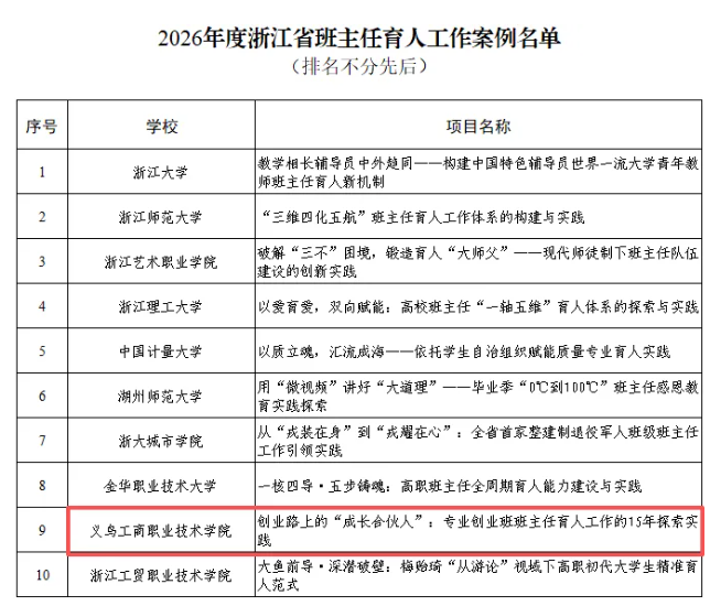 近日,2026年度浙江省高校思想政治工作质量提升综合改革与精品建设项目立项名单公布,我校共四个项目获批省级立项。学院和创业管理处联合申报的《创业路上的“成长合伙人”:专业创业班班主任育人工作15年探索实践》案例成功入选,成为全省班主任育人工作领域十个典型案例之一。