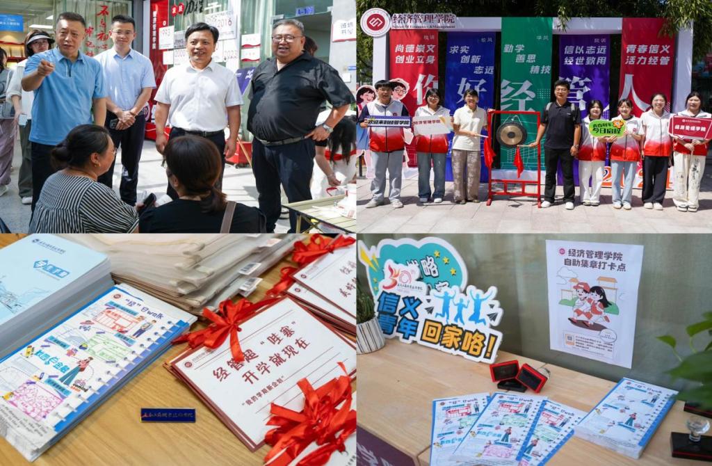 学院报到处秩序井然,经济管理学院为新生准备了丰富的“信”义礼包,内含学院定制手提袋、新学期校历、大学初企划卡等。在学院门前,学院学生工作负责人与新生代表共同鸣锣,表明大学之旅正式启航。在信义客厅、校园e金融银行,络绎不绝的新生拿着“经”日WALK集章卡解锁了大学新生活的开始;在学院“梦想留言区”,新生们与家长共同写下对未来的期许,一笔一划刻下无限憧憬;在“家长休息区”,校院领导、专任教师、辅导员为新生解答关于学习、生活、职业规划等方面的疑问,加强了新生及家长对专业“认同感”和 “归属感”,提前上好大学新生的“人生规划第一课”。