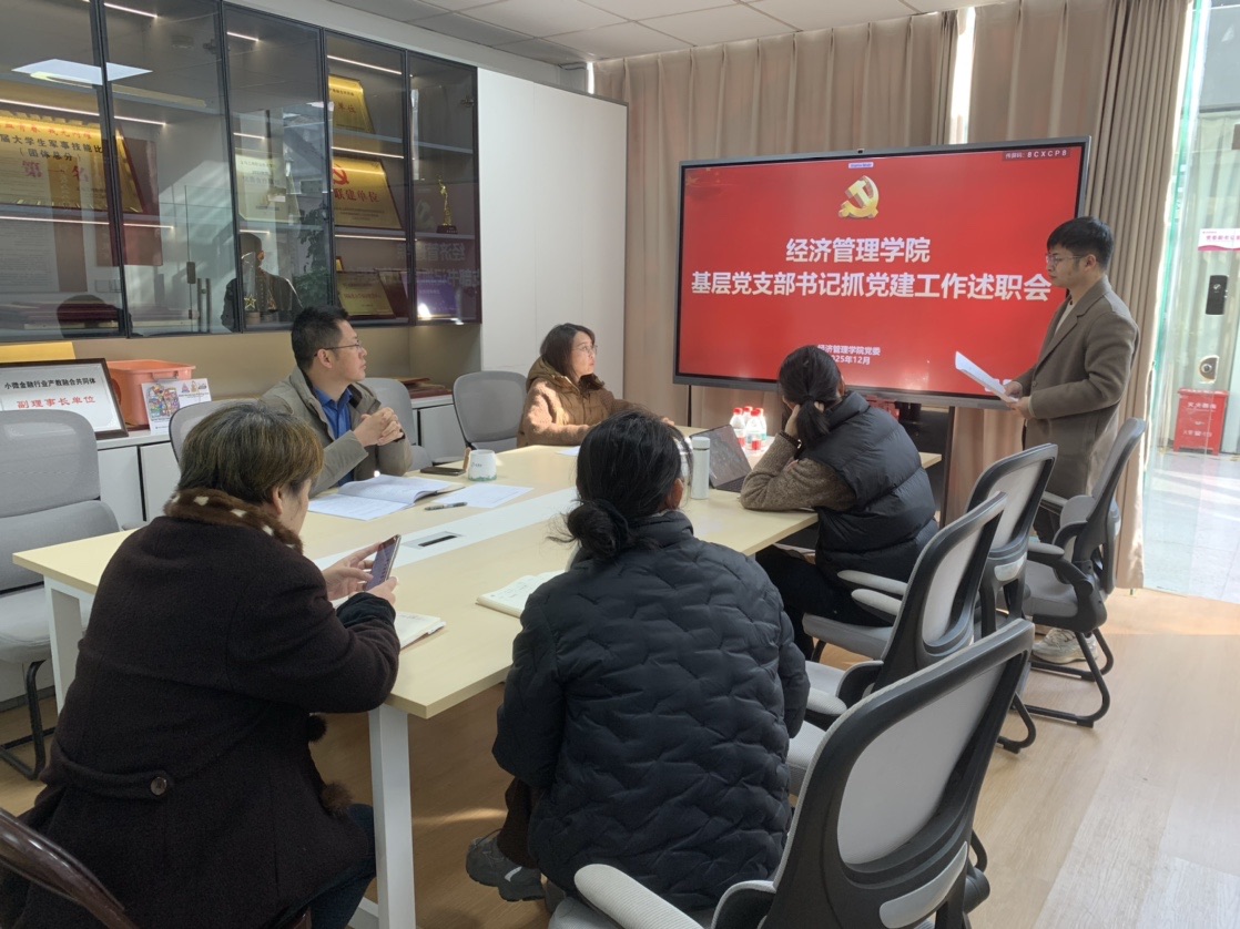 为深入学习领会习近平新时代中国特色社会主义思想,全面贯彻落实党的二十届四中全会精神,持续强化基层党组织政治功能和组织功能,12月29日,经济管理学院召开2025年度基层党支部书记抓党建工作述职会。学院党委负责人主持会议,学院党委委员、各党支部书记参加。